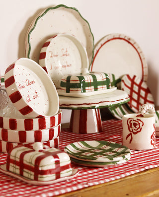 Spread holiday cheer with every butter serving! This charming ceramic butter dish features a vibrant hand-painted red and green plaid pattern that brings festive flair to your table. Crafted from durable stoneware, it keeps butter perfectly fresh while doubling as a delightful seasonal decoration. Since each piece is individually hand-painted, your butter dish is truly one-of-a-kind—making it an ideal gift for Christmas lovers and a treasured addition to any holiday table setting.