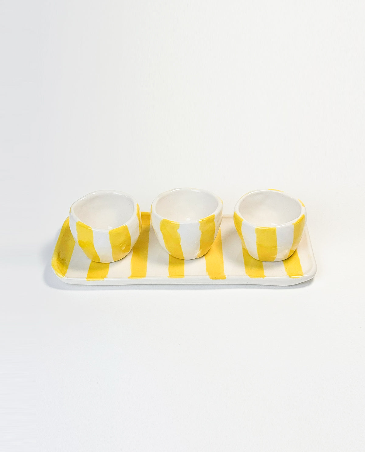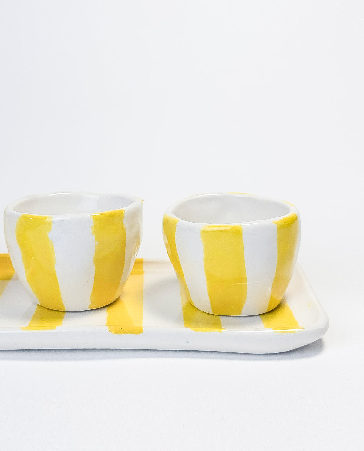 Individually crafted with care, each piece is hand-built, giving it a unique shape that adds to its artisanal charm. This playful white-yellow set includes a matching saucer to complement the handcrafted aesthetic of the mug. Not only can it be used for espresso, but also for raki, tsikoudia, liqueur, hot wine, or Greek coffee.