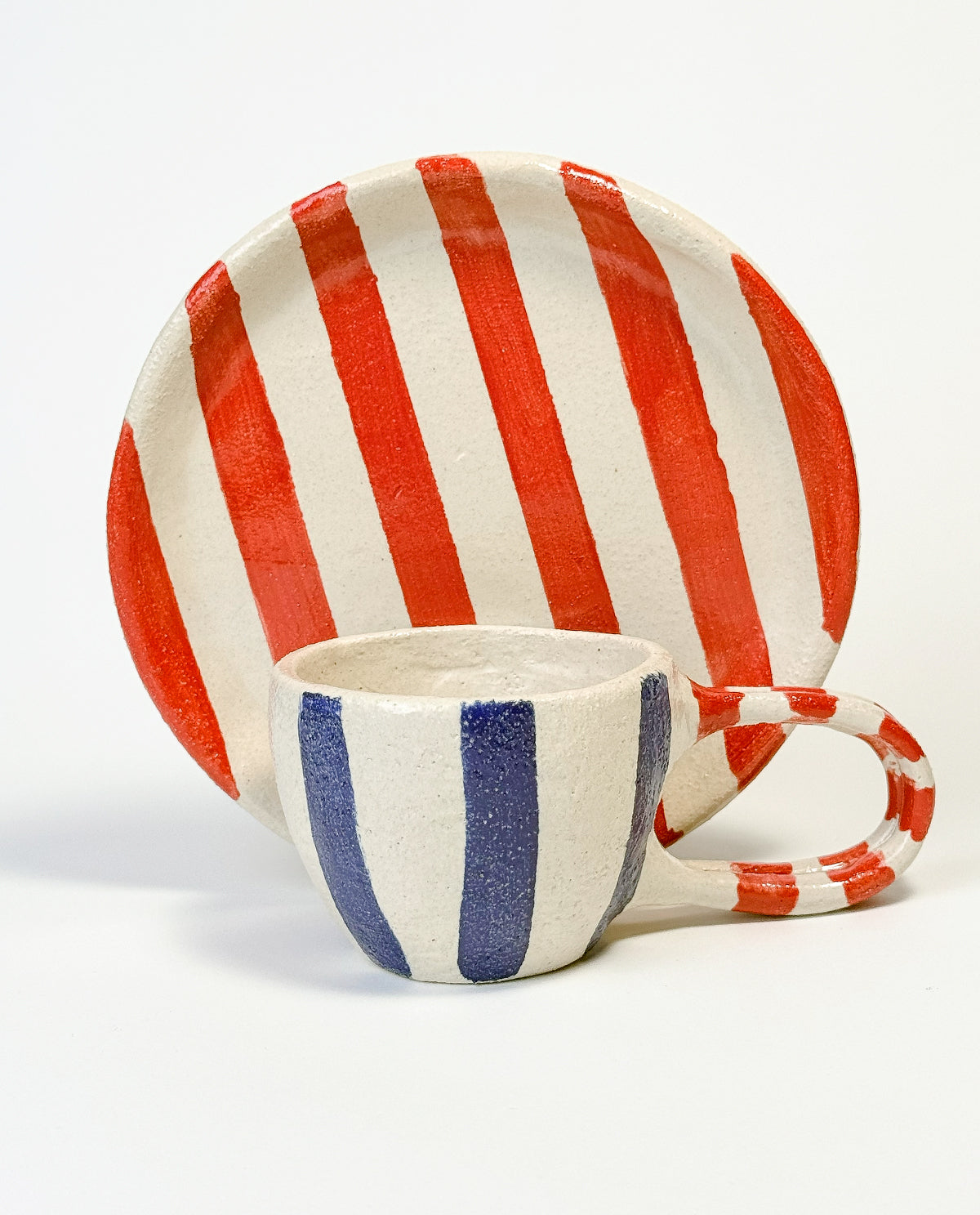 This stripe mug is hand built and hand painted to enjoy a daily dose of your favorite drink! Organically shaped with stoneware clay and painted by hand with vibrant colors, the intention is to bring you joy everyday. Available in two timeless color combos - blue/red or red/orange - and paired with a plate for ultimate satisfaction!
