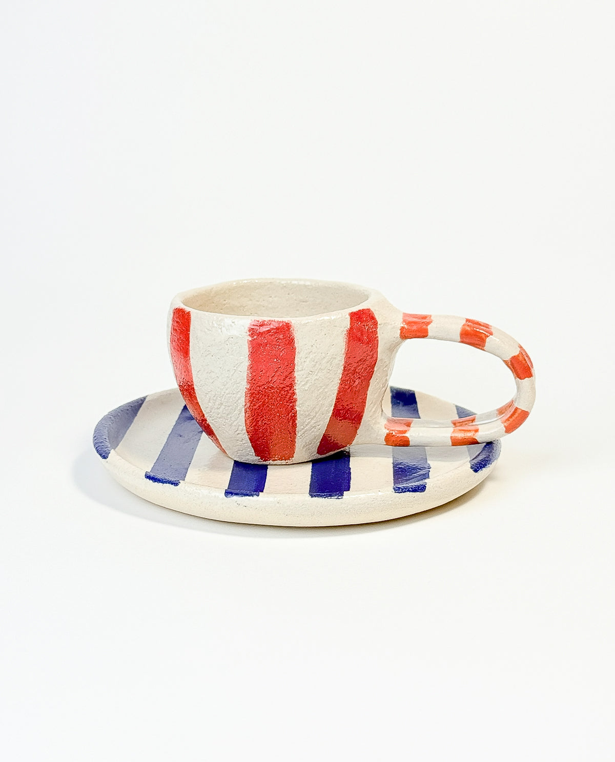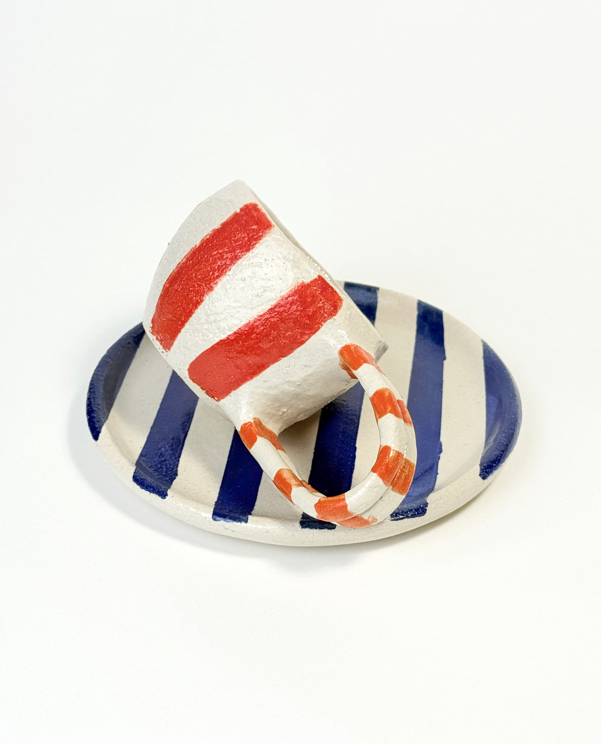 This stripe mug with handle is hand built and hand painted to enjoy a daily dose of your favorite drink! Organically shaped with stoneware clay and painted by hand with vibrant colors, the intention is to bring you joy everyday. Available in two timeless color combos - blue/red or red/orange - and paired with a plate for ultimate satisfaction!