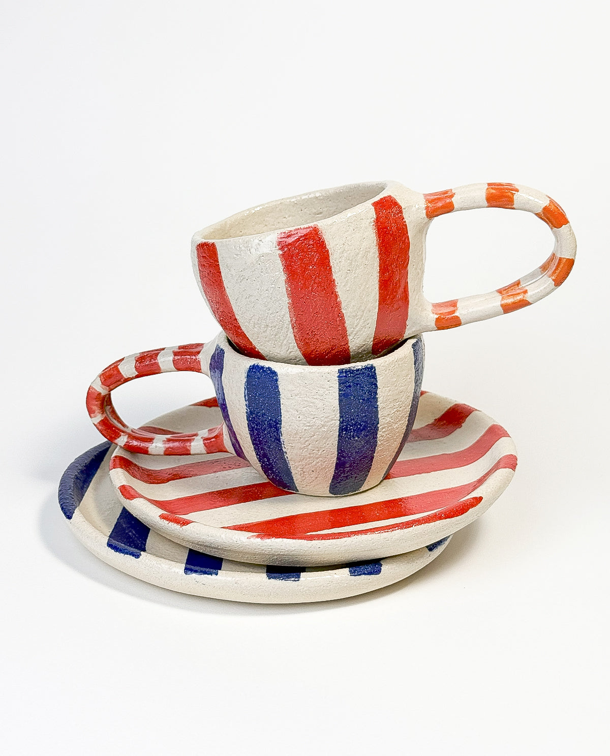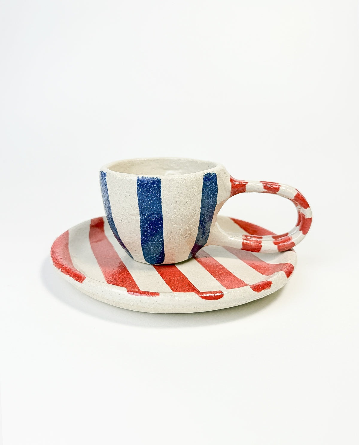 These stripe stoneware mugs are hand built and hand painted to enjoy a daily dose of your favorite coffee! Organically shaped and painted by hand with vibrant colors, the intention is to bring you joy everyday.  Available in two timeless color combos - blue/red or red/orange - and paired with a plate for ultimate satisfaction. A perfect artisanal pottery mug gift as well!