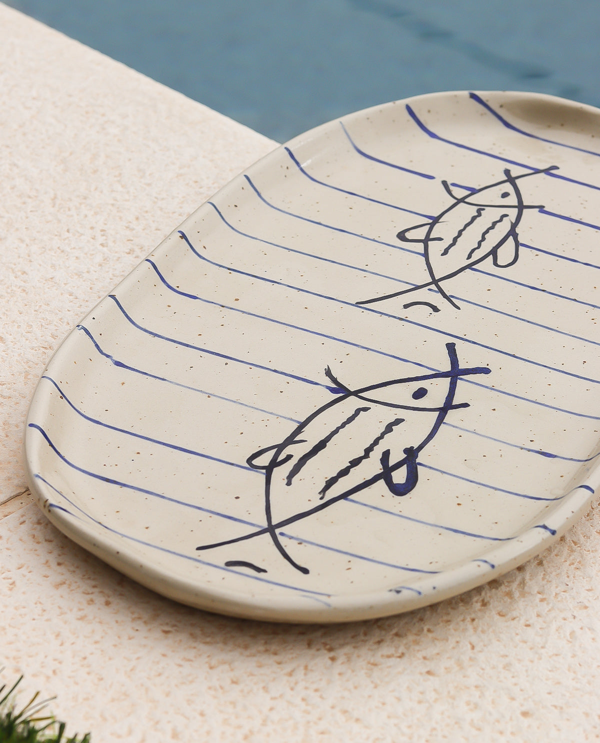 Elevate your summer dishes with this handmade oval serving platter. Crafted with a beautiful fish and stripes drawing, this platter adds a touch of charm to any summer table setting. Handmade with care, it is a must-have for any summer gathering.
