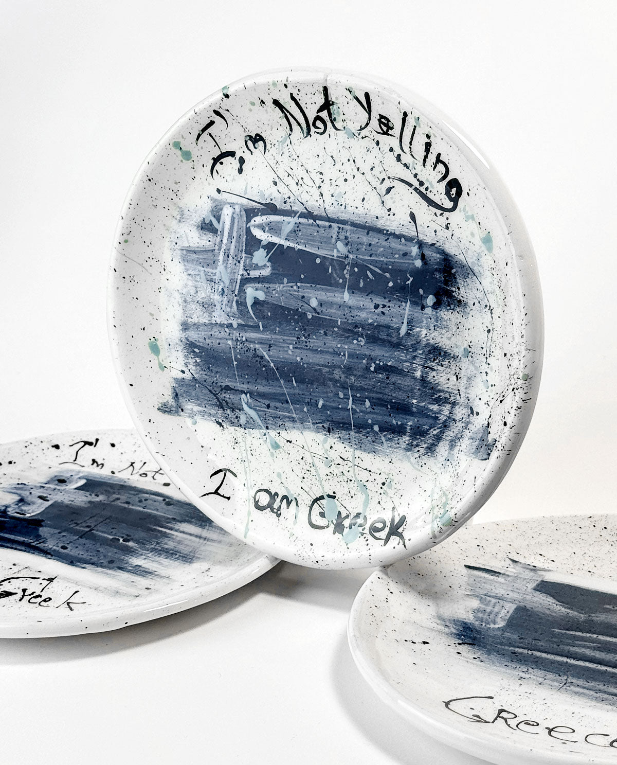 Χειροποίητα κεραμικά πιάτα από τη συλλογή I AM GREEK, ζωγραφισμένα στο χέρι και εμπνευσμένα από την Ελλάδα. Συνδυάζουν τη σύγχρονη αισθητική με την πλούσια παράδοση της ελληνικής κεραμικής τέχνης.